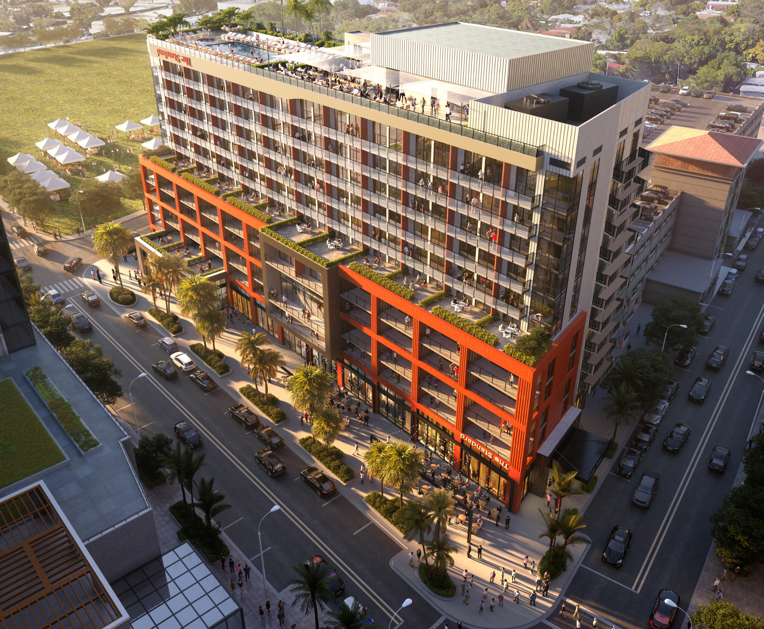 -12 pisos que incluyen 40,000 pies cuadrados de servicios y 14,000 pies cuadrados de tiendas minoristas en la planta baja- Ascensores de alta velocidad con acceso controlado a la propiedad.- Programa de alquiler flexible con estadía mínima de 30 días, 12 veces al año- Servicio de Internet de alta velocidad y WiFi en toda la propiedad.- Amplio vestíbulo con techos altos de doble altura y espacios sociales cuidadosamente personalizados, incluido The Standard Café- Comunidad que admite mascotas con spa de aseo- Terraza en la azotea estilo centro turístico con jardines tropicales que cuenta con una piscina de 60 pies de largo, spa con hidromasaje, cabañas junto a la piscina y duchas de lluvia al aire libre.- Restaurante y bar en la azotea de inspiración global con servicio junto a la piscina y entrega a pedido a residencias- Sala de proyección privada de alta definición con equipos audiovisuales de última generación.- Piso social vibrante con amplio salón, bar de karaoke y cocina y bar gourmet, todos con vista a la cancha de pickleball, ideal para cualquier celebración o reunión.- Piso deportivo con gimnasio de última generación totalmente equipado, terraza de yoga al aire libre, estudio de yoga y meditación interior, saunas de infrarrojos y cancha de pickleball.- Piso de trabajo con espacios de coworking, cuatro salas grandes y sala de juntas privada con internet de alta velocidad- Espacios para guardar bicicletas.- Vestíbulo atendido las 24 horas y servicios de conserjería.