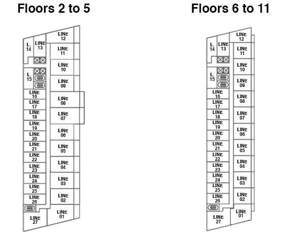 | Lineas 18,20,22,24,26 Niveles 5 - 11 | 2 Hab / 2 Baños (479 SF / 44 M2) |